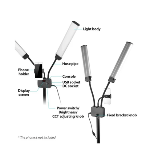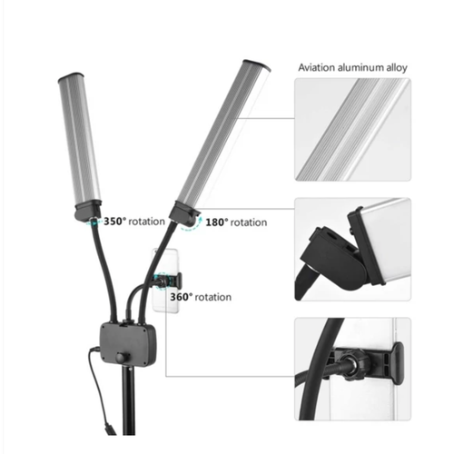 نور بازویی HERO 112 سایز هر بازوی نور اون 28×6 سانتیمتره. این منبع نوری قابلیت چرخش رینگ به همه جهات رو داره؛ بنابراین محدودیتی بابت تنظیم زاویه اون ندارین. اگه به تصویر هم نگاه کنین، بین دو بازو یه هولدر برای قرار دادن گوشی طراحی شده که کار رو براتون سادهتر کرده.